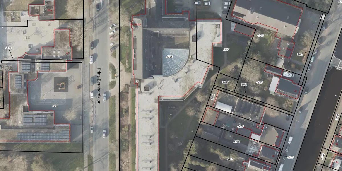Het perceel waarop Prins Bernhardlaan 56-111 staat heeft een oppervlakte van 5369 m². Dit is een zeer groot perceel. De perceeloppervlakte wordt geregistreerd door het Kadaster. Gedetailleerde informatie over de maten van dit perceel kunt u vinden in het rapport Kadastrale kaart met maatvoering van Prins Bernhardlaan 56-111.