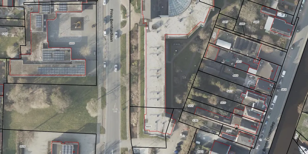 Het perceel waarop Prins Bernhardlaan 56-105 staat heeft een oppervlakte van 5369 m². Dit is een zeer groot perceel. De perceeloppervlakte wordt geregistreerd door het Kadaster. Gedetailleerde informatie over de maten van dit perceel kunt u vinden in het rapport Kadastrale kaart met maatvoering van Prins Bernhardlaan 56-105.