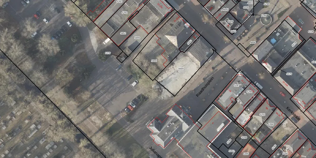 Het perceel waarop Raadhuisplein 7-08 staat heeft een oppervlakte van 604 m². Dit is een groot perceel. De perceeloppervlakte wordt geregistreerd door het Kadaster. Gedetailleerde informatie over de maten van dit perceel kunt u vinden in het rapport Kadastrale kaart met maatvoering van Raadhuisplein 7-08.