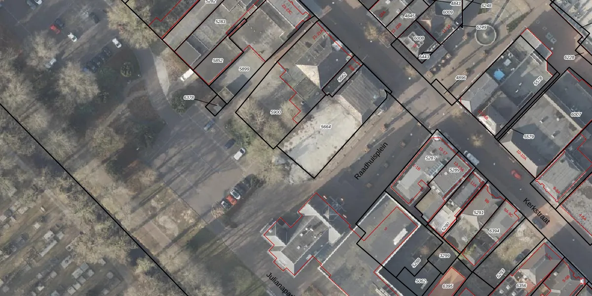 Het perceel waarop Raadhuisplein 7-15 staat heeft een oppervlakte van 604 m². Dit is een groot perceel. De perceeloppervlakte wordt geregistreerd door het Kadaster. Gedetailleerde informatie over de maten van dit perceel kunt u vinden in het rapport Kadastrale kaart met maatvoering van Raadhuisplein 7-15.