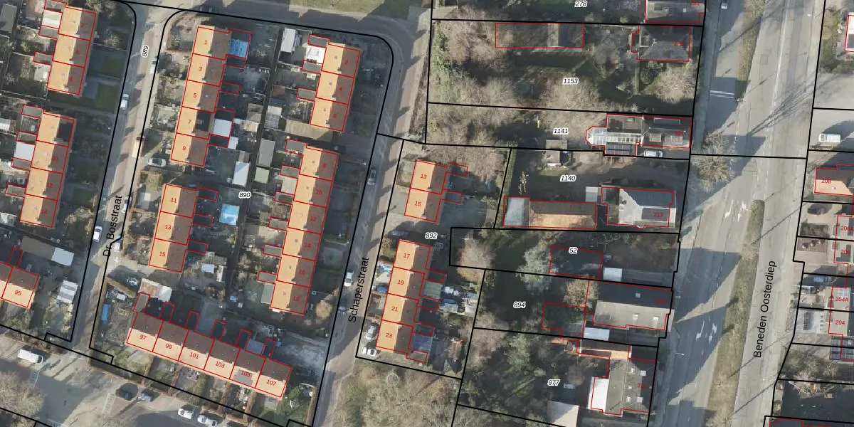 Het perceel waarop Schaperstraat 15 staat heeft een oppervlakte van 1258 m². Dit is een zeer groot perceel. De perceeloppervlakte wordt geregistreerd door het Kadaster. Gedetailleerde informatie over de maten van dit perceel kunt u vinden in het rapport Kadastrale kaart met maatvoering van Schaperstraat 15.
