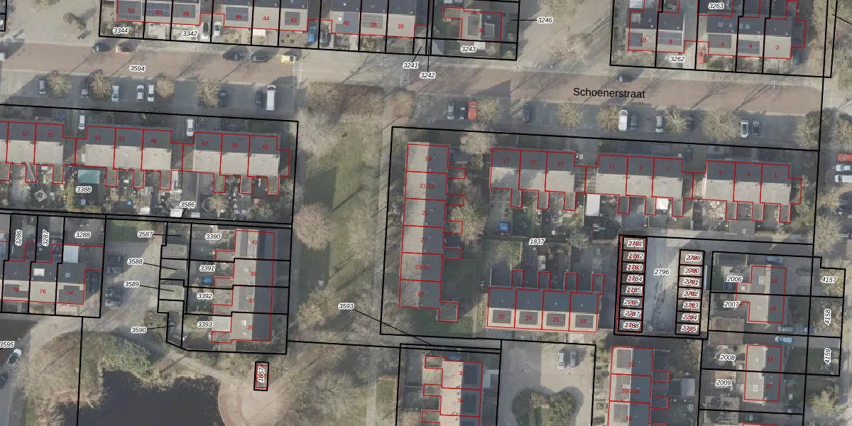 Het perceel waarop Schoenerstraat 25 staat heeft een oppervlakte van 5613 m². Dit is een zeer groot perceel. De perceeloppervlakte wordt geregistreerd door het Kadaster. Gedetailleerde informatie over de maten van dit perceel kunt u vinden in het rapport Kadastrale kaart met maatvoering van Schoenerstraat 25.