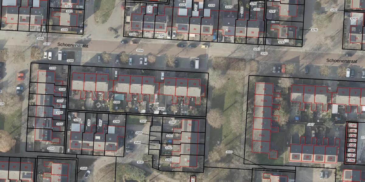 Het perceel waarop Schoenerstraat 45 staat heeft een oppervlakte van 1850 m². Dit is een zeer groot perceel. De perceeloppervlakte wordt geregistreerd door het Kadaster. Gedetailleerde informatie over de maten van dit perceel kunt u vinden in het rapport Kadastrale kaart met maatvoering van Schoenerstraat 45.