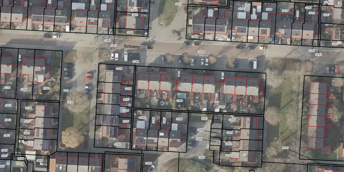 Het perceel waarop Schoenerstraat 55 staat heeft een oppervlakte van 1850 m². Dit is een zeer groot perceel. De perceeloppervlakte wordt geregistreerd door het Kadaster. Gedetailleerde informatie over de maten van dit perceel kunt u vinden in het rapport Kadastrale kaart met maatvoering van Schoenerstraat 55.