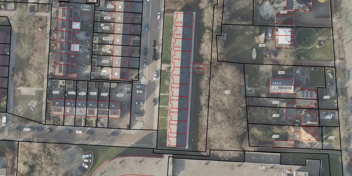 Het perceel waarop Straat Bali 101 staat heeft een oppervlakte van 6959 m². Dit is een zeer groot perceel. De perceeloppervlakte wordt geregistreerd door het Kadaster. Gedetailleerde informatie over de maten van dit perceel kunt u vinden in het rapport Kadastrale kaart met maatvoering van Straat Bali 101.