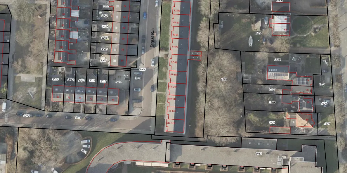 Het perceel waarop Straat Bali 105 staat heeft een oppervlakte van 6959 m². Dit is een zeer groot perceel. De perceeloppervlakte wordt geregistreerd door het Kadaster. Gedetailleerde informatie over de maten van dit perceel kunt u vinden in het rapport Kadastrale kaart met maatvoering van Straat Bali 105.