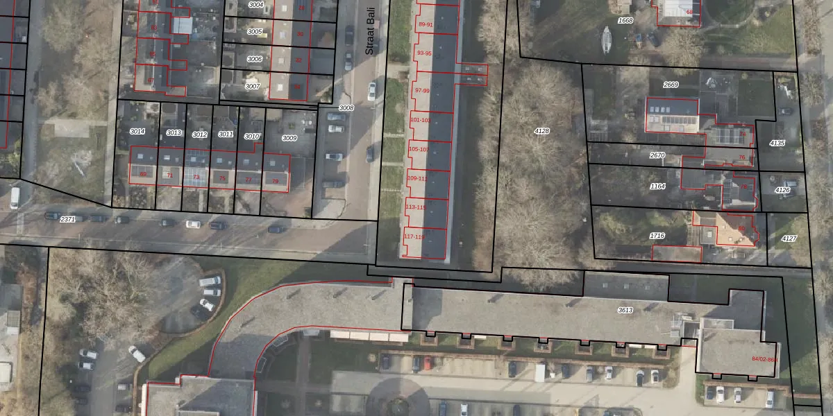 Het perceel waarop Straat Bali 113 staat heeft een oppervlakte van 6959 m². Dit is een zeer groot perceel. De perceeloppervlakte wordt geregistreerd door het Kadaster. Gedetailleerde informatie over de maten van dit perceel kunt u vinden in het rapport Kadastrale kaart met maatvoering van Straat Bali 113.