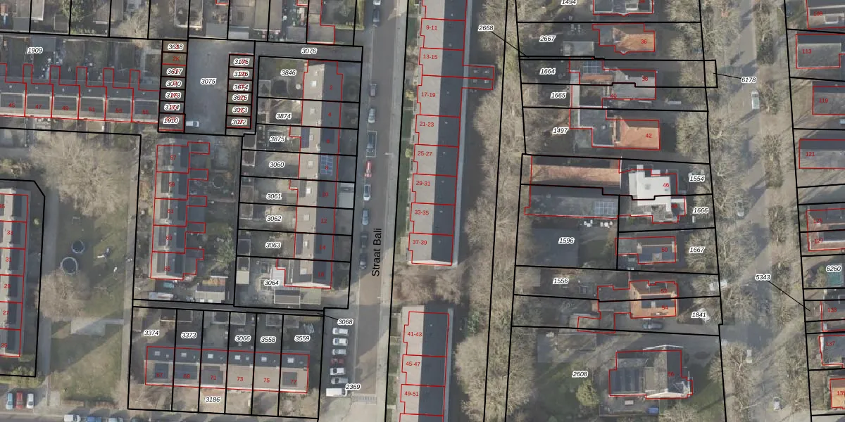 Het perceel waarop Straat Bali 33 staat heeft een oppervlakte van 6959 m². Dit is een zeer groot perceel. De perceeloppervlakte wordt geregistreerd door het Kadaster. Gedetailleerde informatie over de maten van dit perceel kunt u vinden in het rapport Kadastrale kaart met maatvoering van Straat Bali 33.