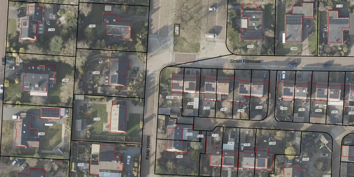 Het perceel waarop Straat Formosa 2 staat heeft een oppervlakte van 425 m². Dit is een groot perceel. De perceeloppervlakte wordt geregistreerd door het Kadaster. Gedetailleerde informatie over de maten van dit perceel kunt u vinden in het rapport Kadastrale kaart met maatvoering van Straat Formosa 2.