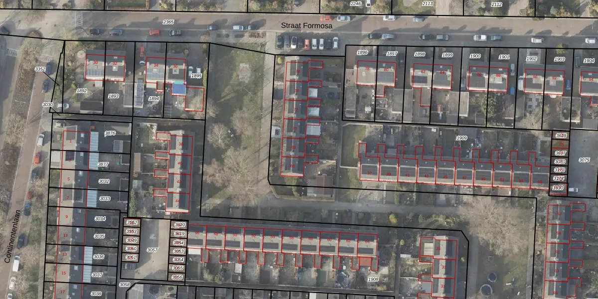 Het perceel waarop Straat Formosa 68 staat heeft een oppervlakte van 3612 m². Dit is een zeer groot perceel. De perceeloppervlakte wordt geregistreerd door het Kadaster. Gedetailleerde informatie over de maten van dit perceel kunt u vinden in het rapport Kadastrale kaart met maatvoering van Straat Formosa 68.