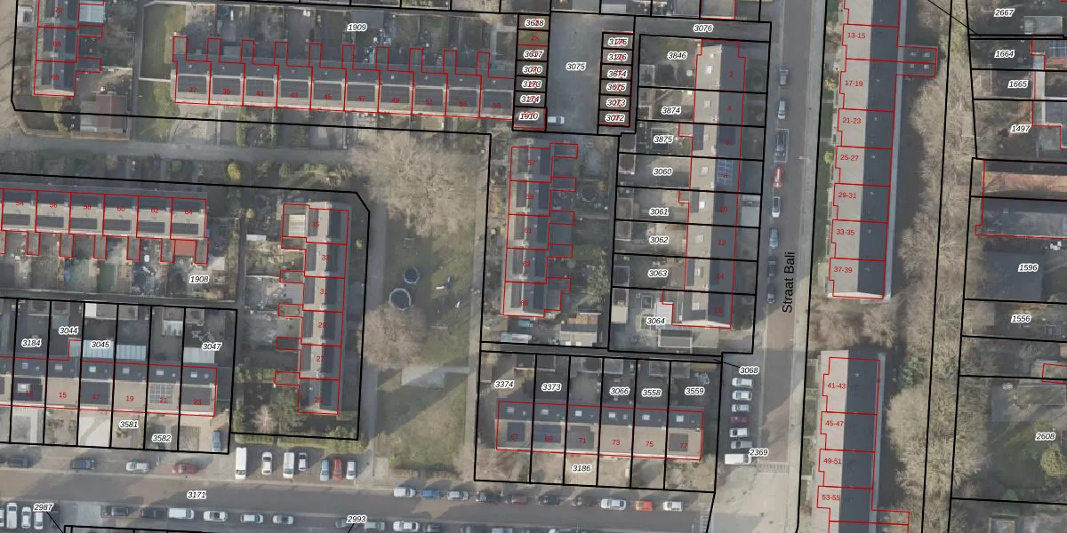 Het perceel waarop Straat Malakka 63 staat heeft een oppervlakte van 3612 m². Dit is een zeer groot perceel. De perceeloppervlakte wordt geregistreerd door het Kadaster. Gedetailleerde informatie over de maten van dit perceel kunt u vinden in het rapport Kadastrale kaart met maatvoering van Straat Malakka 63.