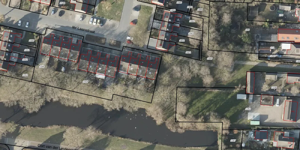 Het perceel waarop ter Laanstraat 25 staat heeft een oppervlakte van 2788 m². Dit is een zeer groot perceel. De perceeloppervlakte wordt geregistreerd door het Kadaster. Gedetailleerde informatie over de maten van dit perceel kunt u vinden in het rapport Kadastrale kaart met maatvoering van ter Laanstraat 25.