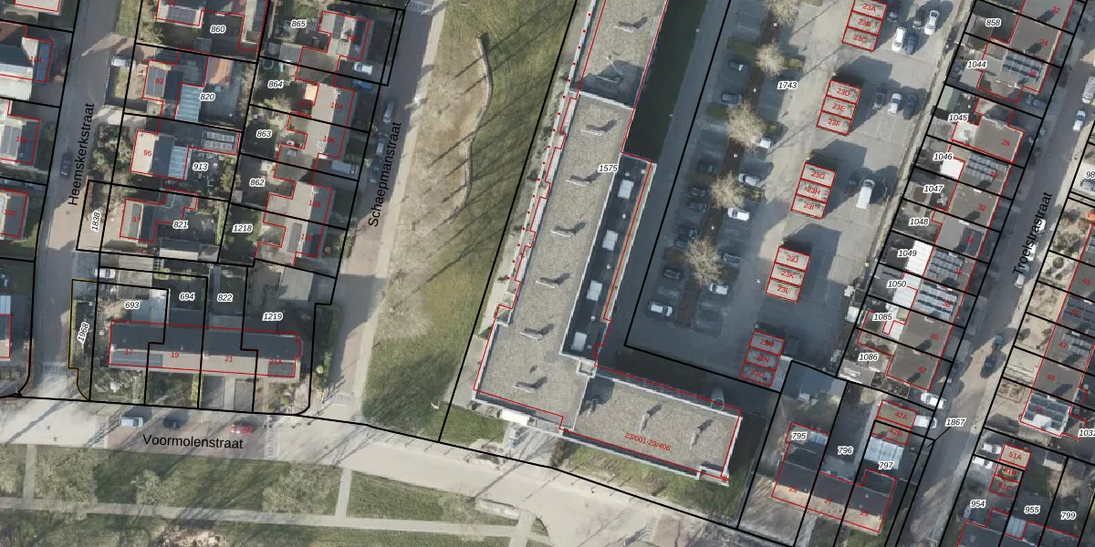 Het perceel waarop Voormolenstraat 23-203 staat heeft een oppervlakte van 3500 m². Dit is een zeer groot perceel. De perceeloppervlakte wordt geregistreerd door het Kadaster. Gedetailleerde informatie over de maten van dit perceel kunt u vinden in het rapport Kadastrale kaart met maatvoering van Voormolenstraat 23-203.