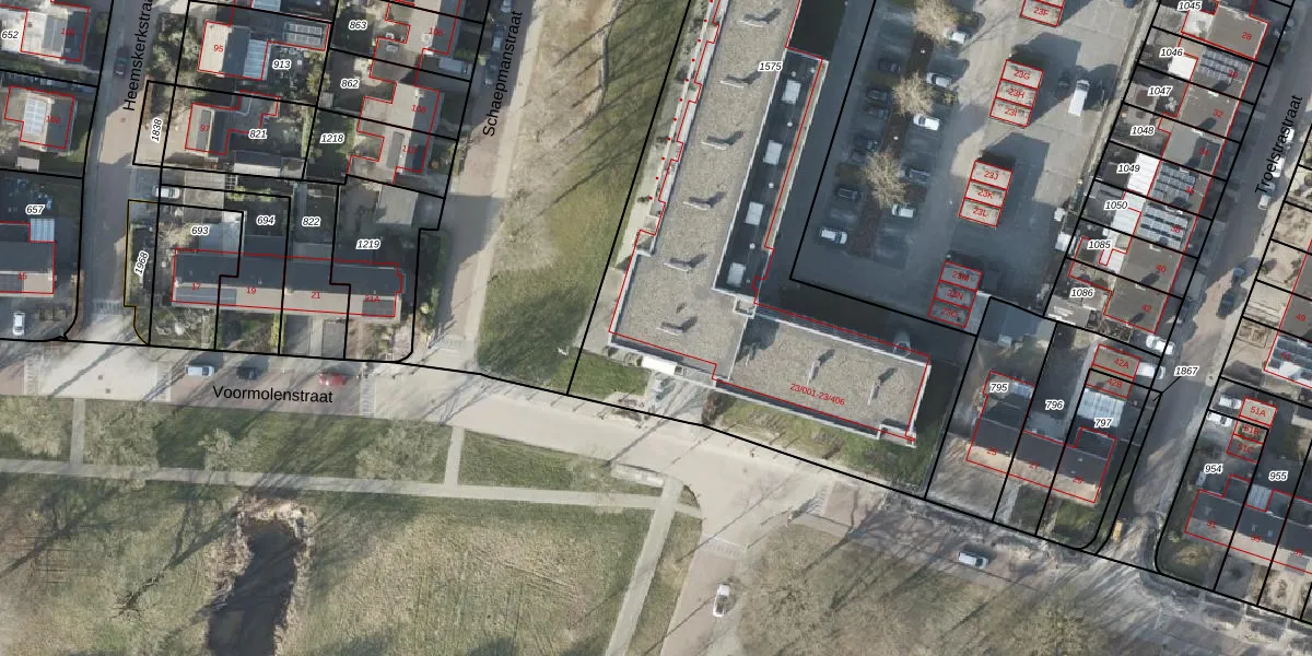 Het perceel waarop Voormolenstraat 23-401 staat heeft een oppervlakte van 3500 m². Dit is een zeer groot perceel. De perceeloppervlakte wordt geregistreerd door het Kadaster. Gedetailleerde informatie over de maten van dit perceel kunt u vinden in het rapport Kadastrale kaart met maatvoering van Voormolenstraat 23-401.