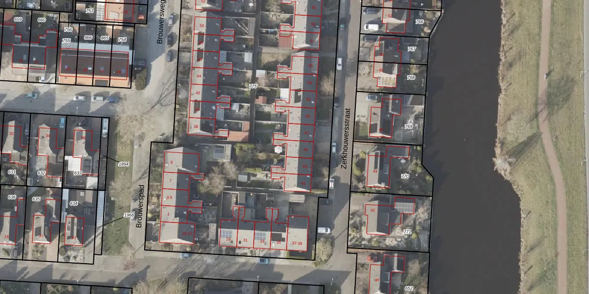 Het perceel waarop Zerkhouwersstraat 45 staat heeft een oppervlakte van 6362 m². Dit is een zeer groot perceel. De perceeloppervlakte wordt geregistreerd door het Kadaster. Gedetailleerde informatie over de maten van dit perceel kunt u vinden in het rapport Kadastrale kaart met maatvoering van Zerkhouwersstraat 45.