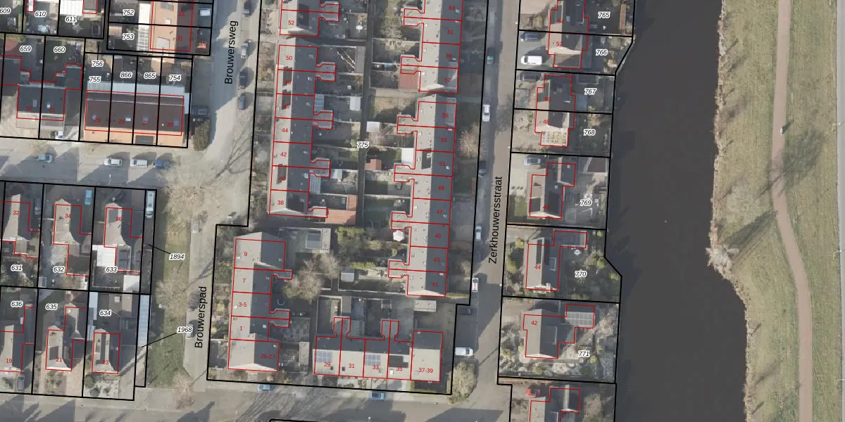 Het perceel waarop Zerkhouwersstraat 47 staat heeft een oppervlakte van 6362 m². Dit is een zeer groot perceel. De perceeloppervlakte wordt geregistreerd door het Kadaster. Gedetailleerde informatie over de maten van dit perceel kunt u vinden in het rapport Kadastrale kaart met maatvoering van Zerkhouwersstraat 47.