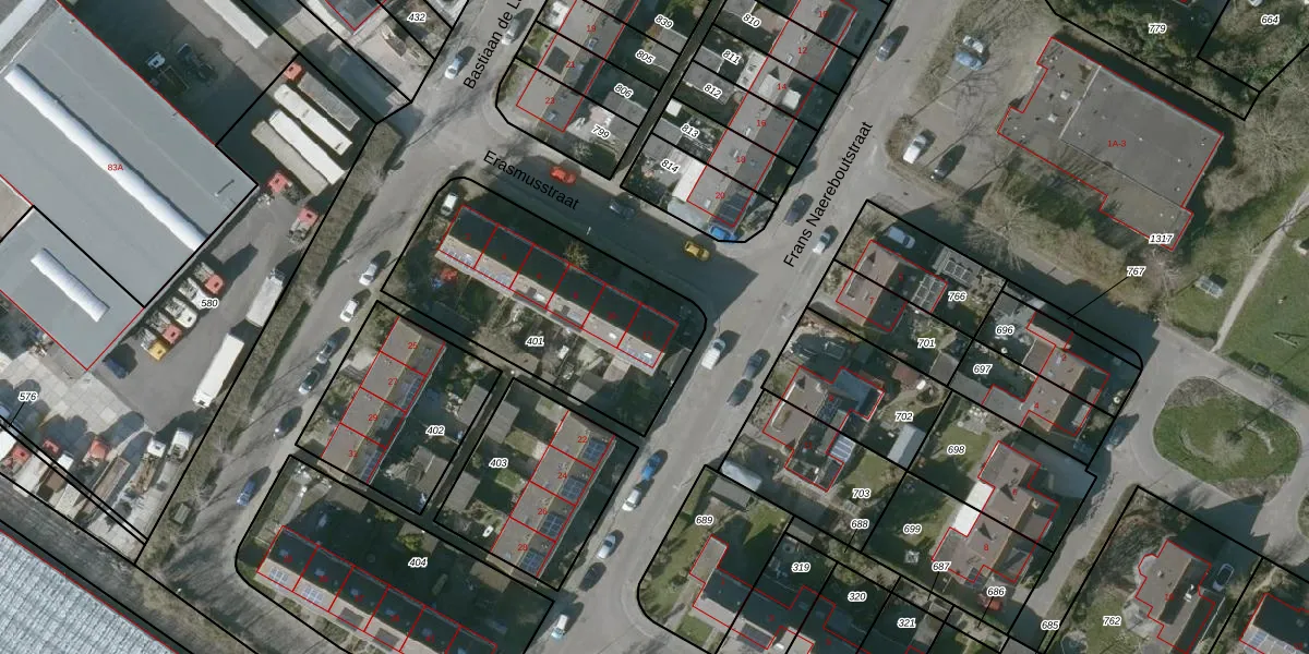 Het perceel waarop Erasmusstraat 12 staat heeft een oppervlakte van 995 m². Dit is een groot perceel. De perceeloppervlakte wordt geregistreerd door het Kadaster. Gedetailleerde informatie over de maten van dit perceel kunt u vinden in het rapport Kadastrale kaart met maatvoering van Erasmusstraat 12.