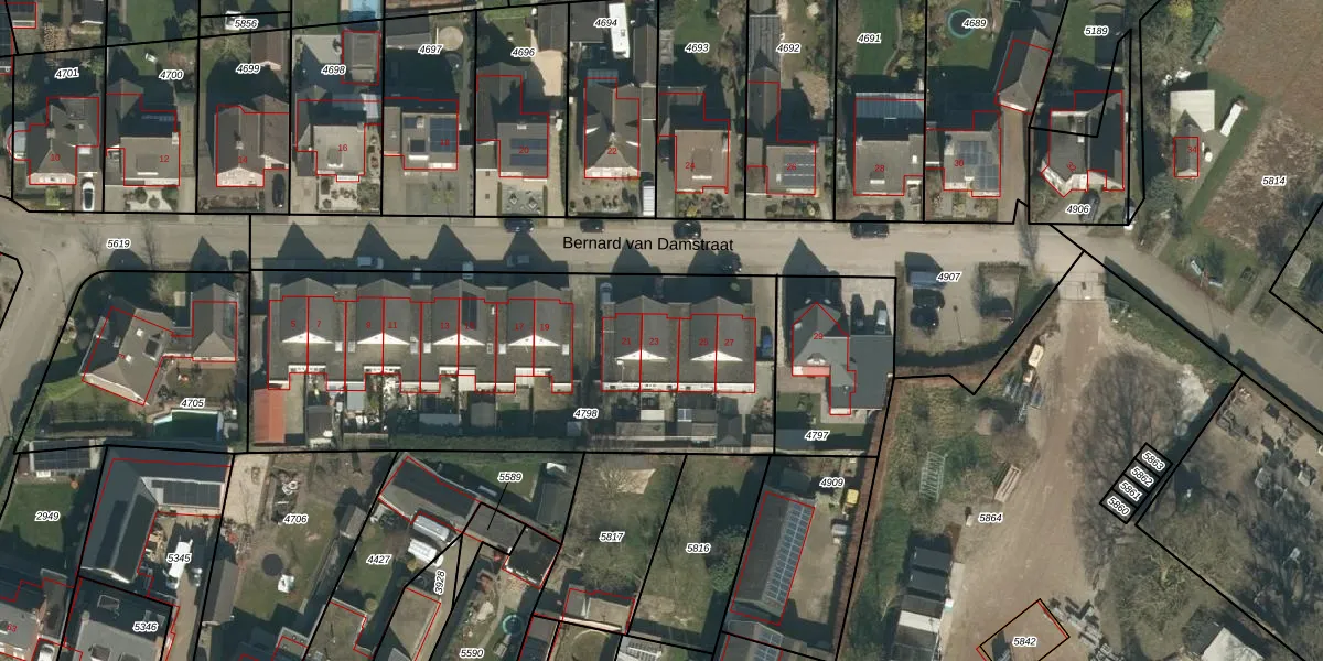Het perceel waarop Bernard van Damstraat 23 staat heeft een oppervlakte van 2125 m². Dit is een zeer groot perceel. De perceeloppervlakte wordt geregistreerd door het Kadaster. Gedetailleerde informatie over de maten van dit perceel kunt u vinden in het rapport Kadastrale kaart met maatvoering van Bernard van Damstraat 23.