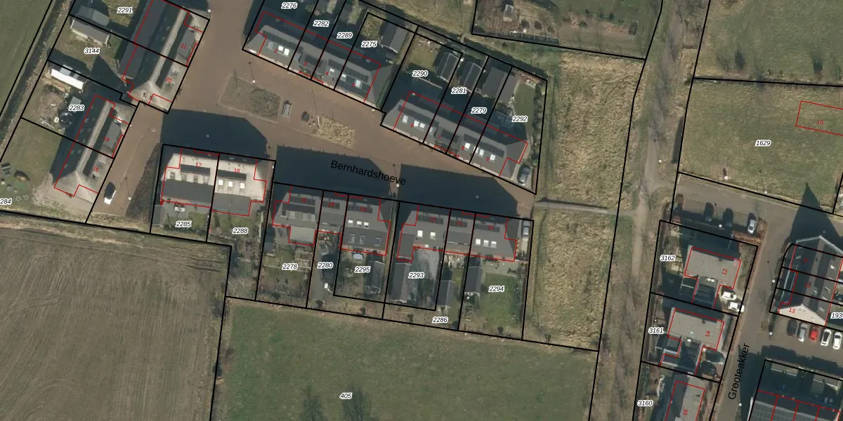 Het perceel waarop Bernhardshoeve 12 staat heeft een oppervlakte van 298 m². Dit is een middelgroot perceel. De perceeloppervlakte wordt geregistreerd door het Kadaster. Gedetailleerde informatie over de maten van dit perceel kunt u vinden in het rapport Kadastrale kaart met maatvoering van Bernhardshoeve 12.