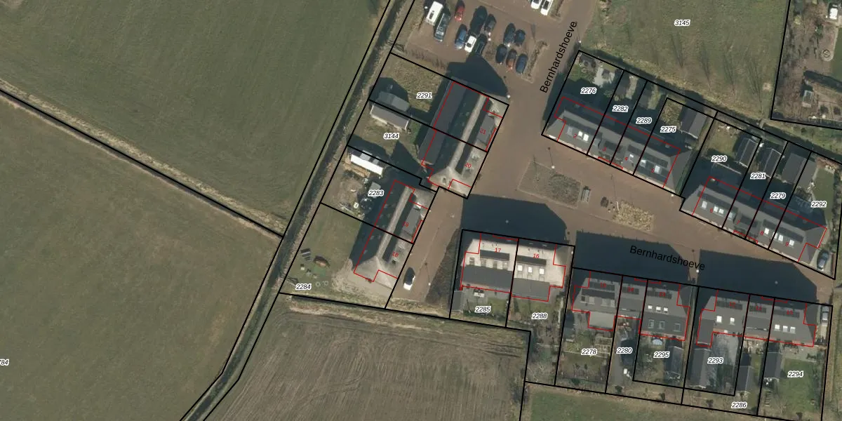 Het perceel waarop Bernhardshoeve 19 staat heeft een oppervlakte van 355 m². Dit is een groot perceel. De perceeloppervlakte wordt geregistreerd door het Kadaster. Gedetailleerde informatie over de maten van dit perceel kunt u vinden in het rapport Kadastrale kaart met maatvoering van Bernhardshoeve 19.