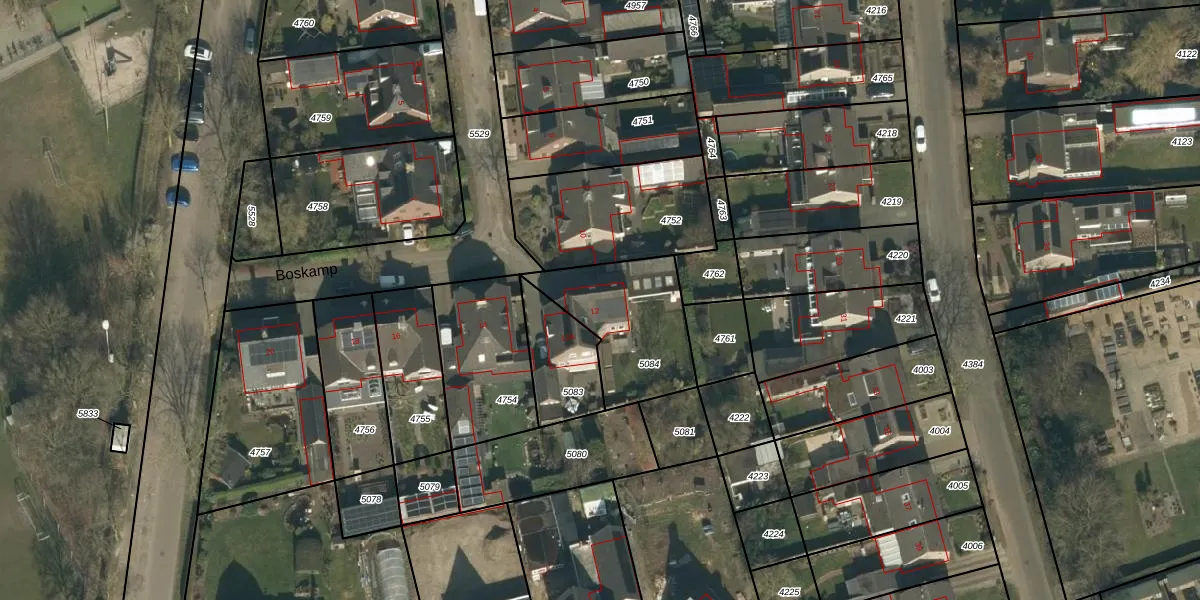 Boskamp 12 is gelegen op kadastraal perceel VHL00E5084. Deze kadastrale aanduiding is uniek en wordt gebruikt door het Kadaster om eigendomsrechten en andere zakelijke rechten vast te leggen. Het perceel maakt onderdeel uit van de kadastrale gemeente Veghel.