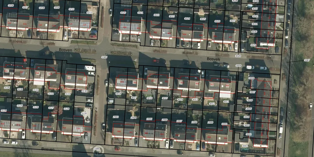 Het perceel waarop Bosven 321 staat heeft een oppervlakte van 256 m². Dit is een middelgroot perceel. De perceeloppervlakte wordt geregistreerd door het Kadaster. Gedetailleerde informatie over de maten van dit perceel kunt u vinden in het rapport Kadastrale kaart met maatvoering van Bosven 321.