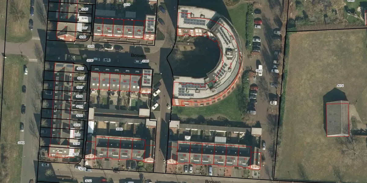Het perceel waarop Bosven 44 staat heeft een oppervlakte van 7536 m². Dit is een zeer groot perceel. De perceeloppervlakte wordt geregistreerd door het Kadaster. Gedetailleerde informatie over de maten van dit perceel kunt u vinden in het rapport Kadastrale kaart met maatvoering van Bosven 44.