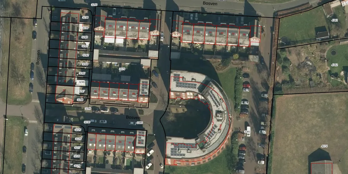 Het perceel waarop Bosven 55 staat heeft een oppervlakte van 7536 m². Dit is een zeer groot perceel. De perceeloppervlakte wordt geregistreerd door het Kadaster. Gedetailleerde informatie over de maten van dit perceel kunt u vinden in het rapport Kadastrale kaart met maatvoering van Bosven 55.