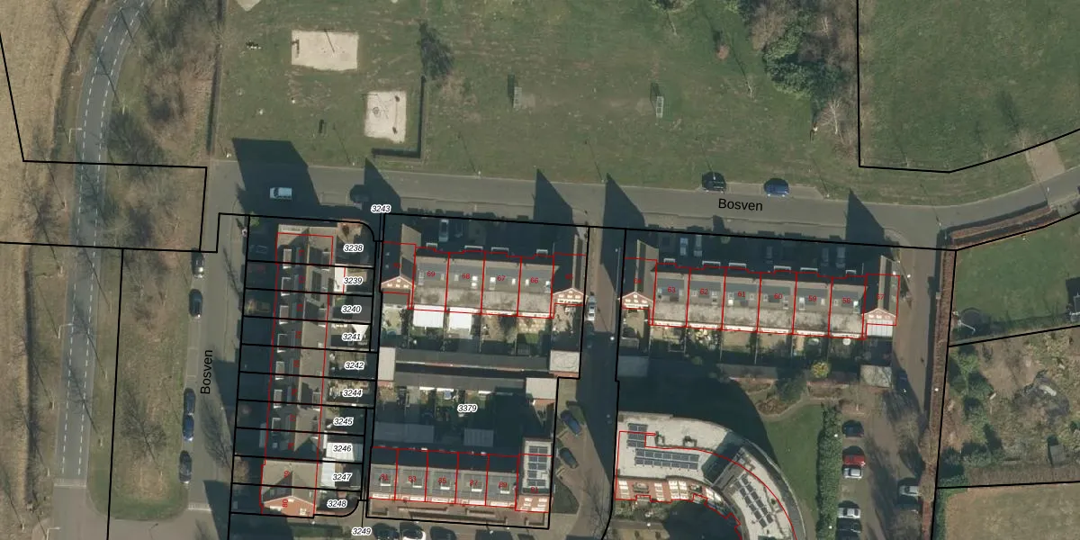 Het perceel waarop Bosven 66 staat heeft een oppervlakte van 2012 m². Dit is een zeer groot perceel. De perceeloppervlakte wordt geregistreerd door het Kadaster. Gedetailleerde informatie over de maten van dit perceel kunt u vinden in het rapport Kadastrale kaart met maatvoering van Bosven 66.