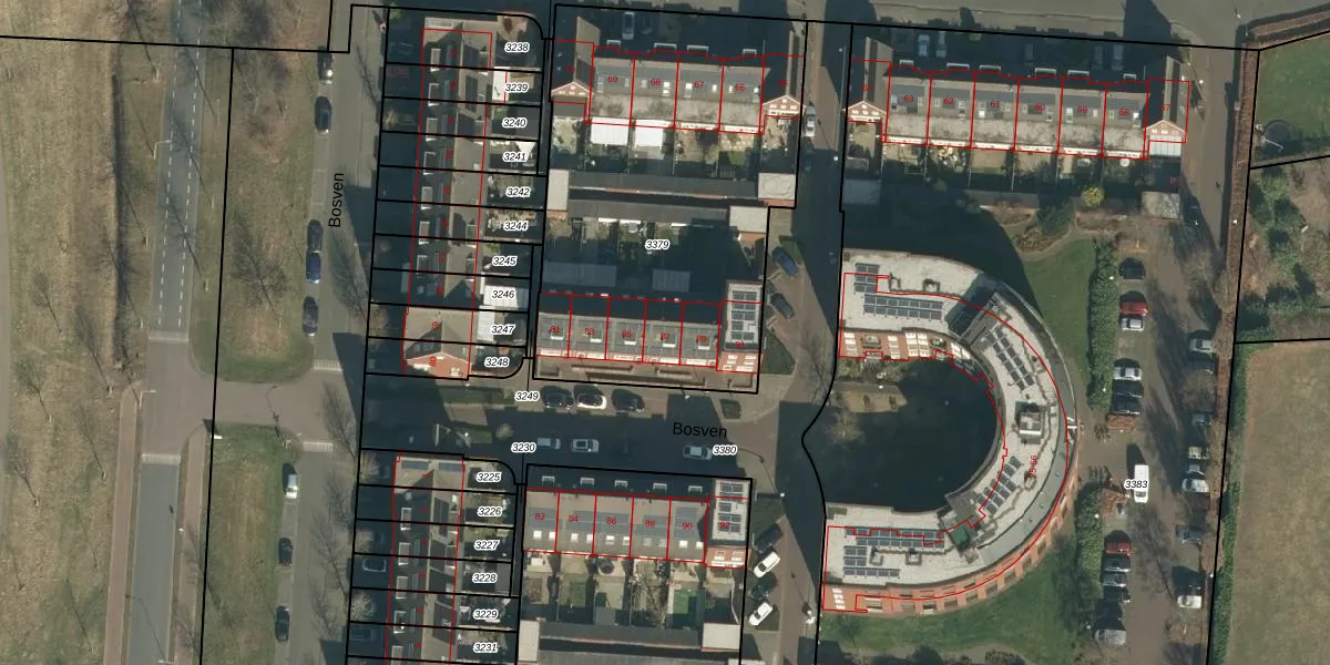 Het perceel waarop Bosven 87 staat heeft een oppervlakte van 2012 m². Dit is een zeer groot perceel. De perceeloppervlakte wordt geregistreerd door het Kadaster. Gedetailleerde informatie over de maten van dit perceel kunt u vinden in het rapport Kadastrale kaart met maatvoering van Bosven 87.
