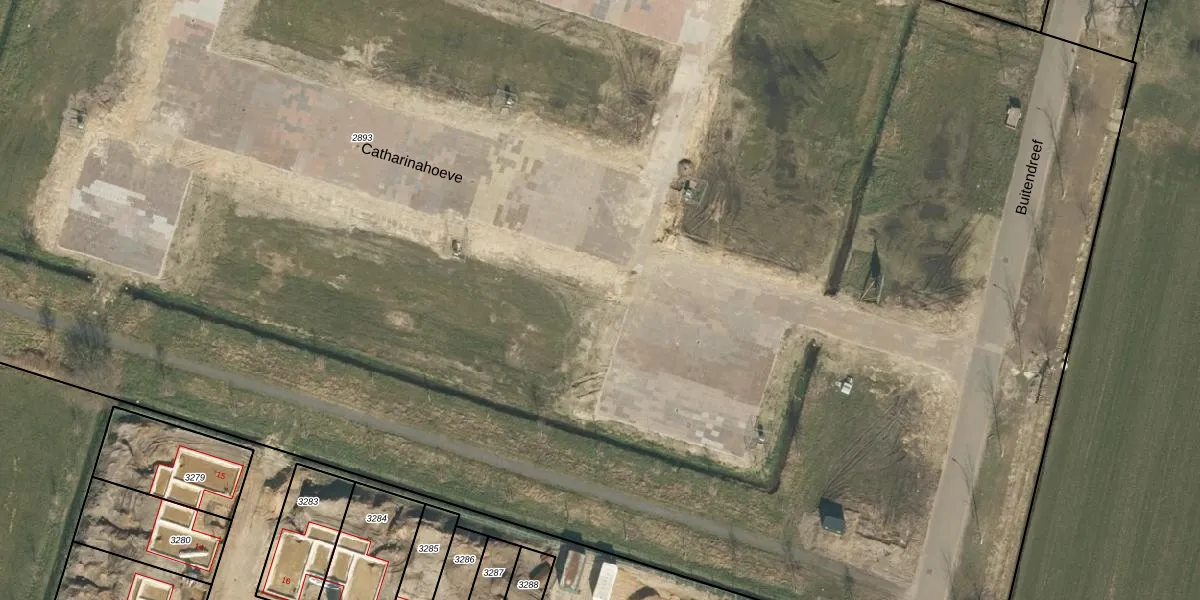 Het perceel waarop Catharinahoeve 1 staat heeft een oppervlakte van 2,5 ha. Dit is een zeer groot perceel. De perceeloppervlakte wordt geregistreerd door het Kadaster. Gedetailleerde informatie over de maten van dit perceel kunt u vinden in het rapport Kadastrale kaart met maatvoering van Catharinahoeve 1.