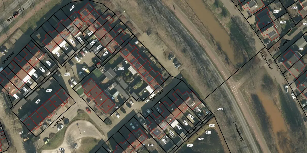 Het perceel waarop Cederlaar 100 staat heeft een oppervlakte van 1690 m². Dit is een zeer groot perceel. De perceeloppervlakte wordt geregistreerd door het Kadaster. Gedetailleerde informatie over de maten van dit perceel kunt u vinden in het rapport Kadastrale kaart met maatvoering van Cederlaar 100.