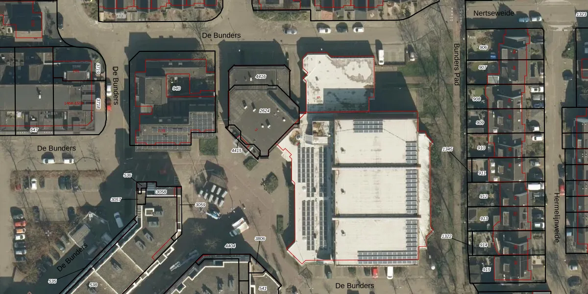 Het perceel waarop De Bunders 1 staat heeft een oppervlakte van 3,3 ha. Dit is een zeer groot perceel. De perceeloppervlakte wordt geregistreerd door het Kadaster. Gedetailleerde informatie over de maten van dit perceel kunt u vinden in het rapport Kadastrale kaart met maatvoering van De Bunders 1.