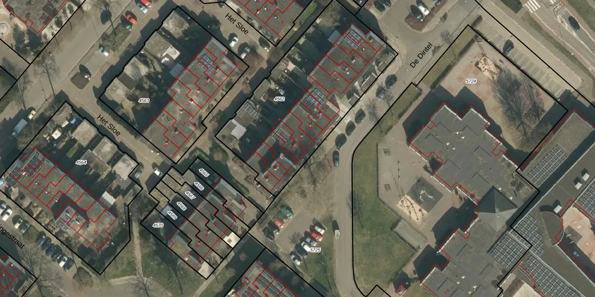 Het perceel waarop De Dintel 19 staat heeft een oppervlakte van 1787 m². Dit is een zeer groot perceel. De perceeloppervlakte wordt geregistreerd door het Kadaster. Gedetailleerde informatie over de maten van dit perceel kunt u vinden in het rapport Kadastrale kaart met maatvoering van De Dintel 19.