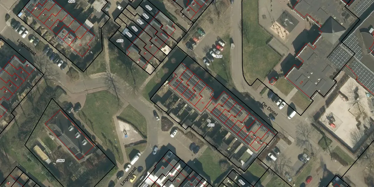 Het perceel waarop De Dintel 43 staat heeft een oppervlakte van 1844 m². Dit is een zeer groot perceel. De perceeloppervlakte wordt geregistreerd door het Kadaster. Gedetailleerde informatie over de maten van dit perceel kunt u vinden in het rapport Kadastrale kaart met maatvoering van De Dintel 43.