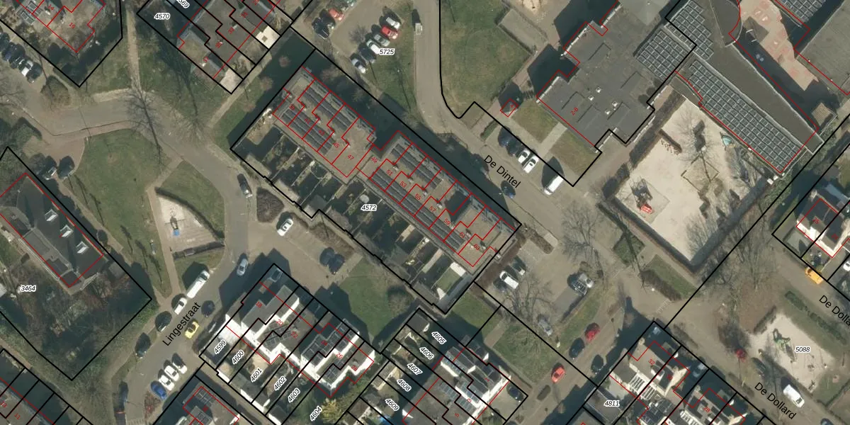 Het perceel waarop De Dintel 57 staat heeft een oppervlakte van 1844 m². Dit is een zeer groot perceel. De perceeloppervlakte wordt geregistreerd door het Kadaster. Gedetailleerde informatie over de maten van dit perceel kunt u vinden in het rapport Kadastrale kaart met maatvoering van De Dintel 57.