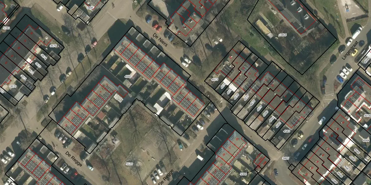 Het perceel waarop De Niers 17 staat heeft een oppervlakte van 2694 m². Dit is een zeer groot perceel. De perceeloppervlakte wordt geregistreerd door het Kadaster. Gedetailleerde informatie over de maten van dit perceel kunt u vinden in het rapport Kadastrale kaart met maatvoering van De Niers 17.