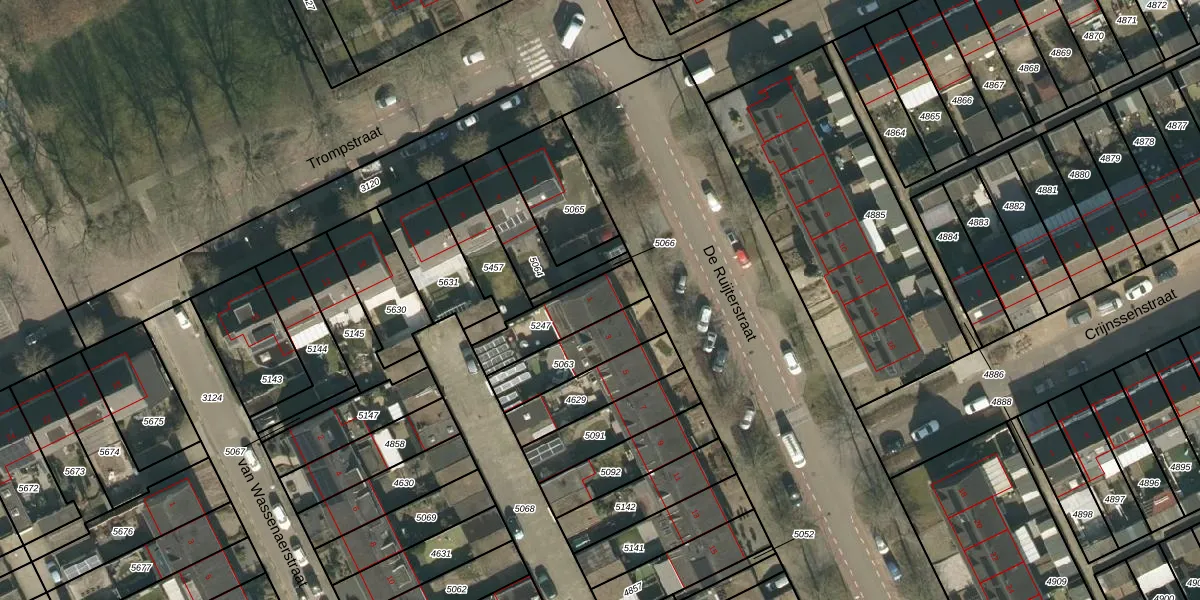 Het perceel waarop De Ruijterstraat 1 staat heeft een oppervlakte van 197 m². Dit is een middelgroot perceel. De perceeloppervlakte wordt geregistreerd door het Kadaster. Gedetailleerde informatie over de maten van dit perceel kunt u vinden in het rapport Kadastrale kaart met maatvoering van De Ruijterstraat 1.
