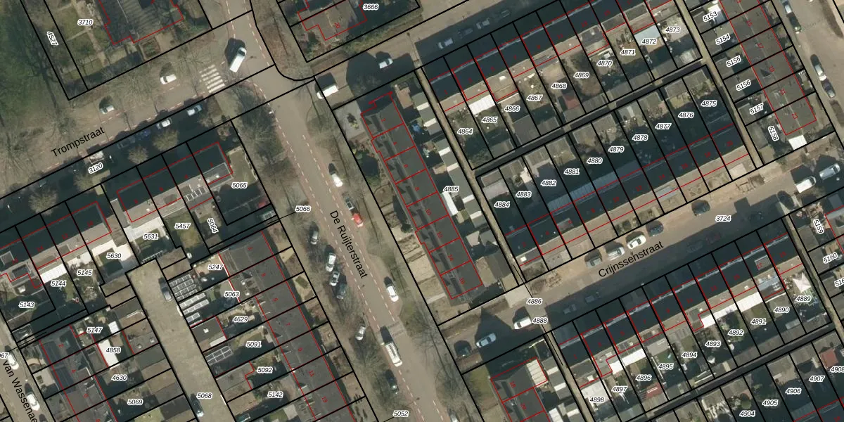 Het perceel waarop De Ruijterstraat 10 staat heeft een oppervlakte van 1230 m². Dit is een zeer groot perceel. De perceeloppervlakte wordt geregistreerd door het Kadaster. Gedetailleerde informatie over de maten van dit perceel kunt u vinden in het rapport Kadastrale kaart met maatvoering van De Ruijterstraat 10.