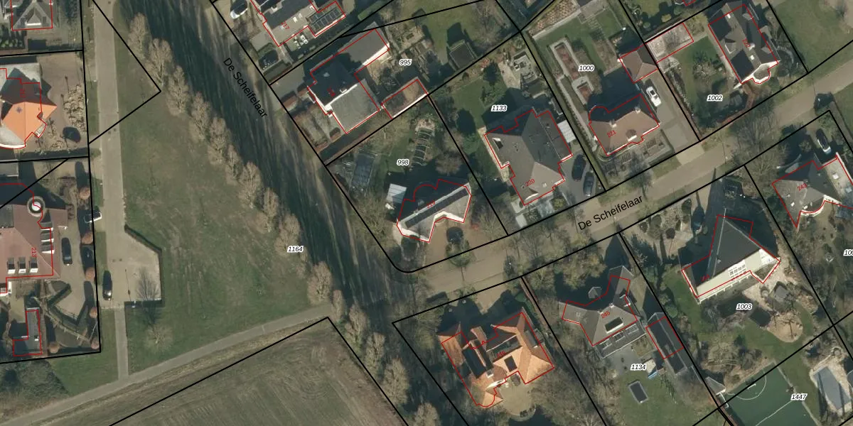 Het perceel waarop De Scheifelaar 219 staat heeft een oppervlakte van 961 m². Dit is een groot perceel. De perceeloppervlakte wordt geregistreerd door het Kadaster. Gedetailleerde informatie over de maten van dit perceel kunt u vinden in het rapport Kadastrale kaart met maatvoering van De Scheifelaar 219.
