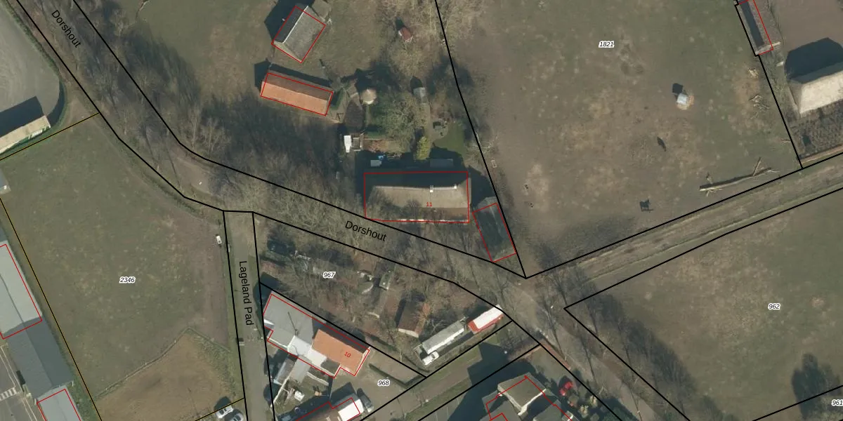 Het perceel waarop Dorshout 11 staat heeft een oppervlakte van 8910 m². Dit is een zeer groot perceel. De perceeloppervlakte wordt geregistreerd door het Kadaster. Gedetailleerde informatie over de maten van dit perceel kunt u vinden in het rapport Kadastrale kaart met maatvoering van Dorshout 11.