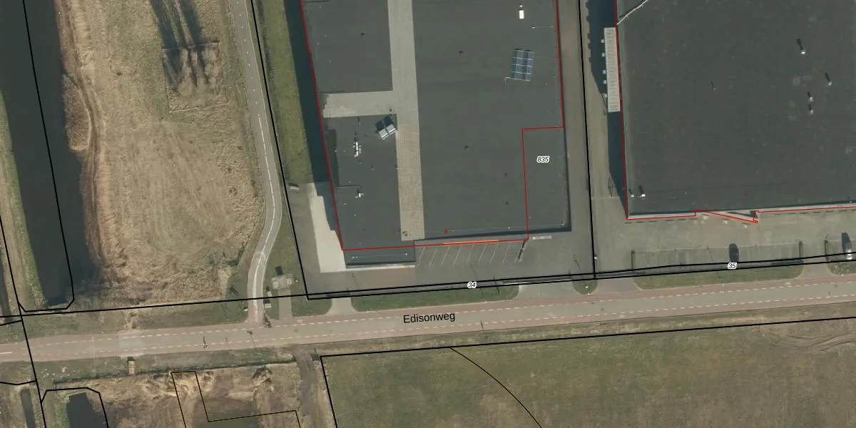 Het perceel waarop Edisonweg 9 staat heeft een oppervlakte van 5915 m². Dit is een zeer groot perceel. De perceeloppervlakte wordt geregistreerd door het Kadaster. Gedetailleerde informatie over de maten van dit perceel kunt u vinden in het rapport Kadastrale kaart met maatvoering van Edisonweg 9.