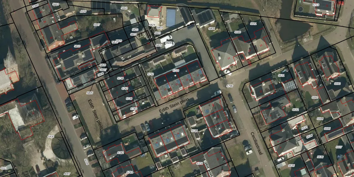 Edith Stein plein 13 is gelegen op kadastraal perceel VHL00E5733. Deze kadastrale aanduiding is uniek en wordt gebruikt door het Kadaster om eigendomsrechten en andere zakelijke rechten vast te leggen. Het perceel maakt onderdeel uit van de kadastrale gemeente Veghel.