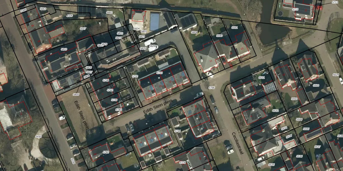 Het perceel waarop Edith Stein plein 15 staat heeft een oppervlakte van 820 m². Dit is een groot perceel. De perceeloppervlakte wordt geregistreerd door het Kadaster. Gedetailleerde informatie over de maten van dit perceel kunt u vinden in het rapport Kadastrale kaart met maatvoering van Edith Stein plein 15.