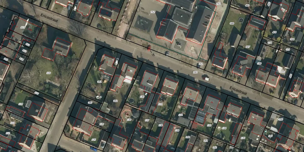 Het perceel waarop Ericastraat 8 staat heeft een oppervlakte van 475 m². Dit is een groot perceel. De perceeloppervlakte wordt geregistreerd door het Kadaster. Gedetailleerde informatie over de maten van dit perceel kunt u vinden in het rapport Kadastrale kaart met maatvoering van Ericastraat 8.