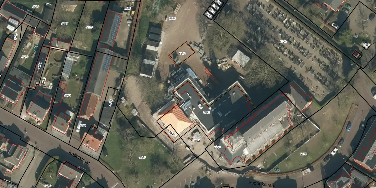 Het perceel waarop Esdonkstraat 8-A staat heeft een oppervlakte van 845 m². Dit is een groot perceel. De perceeloppervlakte wordt geregistreerd door het Kadaster. Gedetailleerde informatie over de maten van dit perceel kunt u vinden in het rapport Kadastrale kaart met maatvoering van Esdonkstraat 8-A.