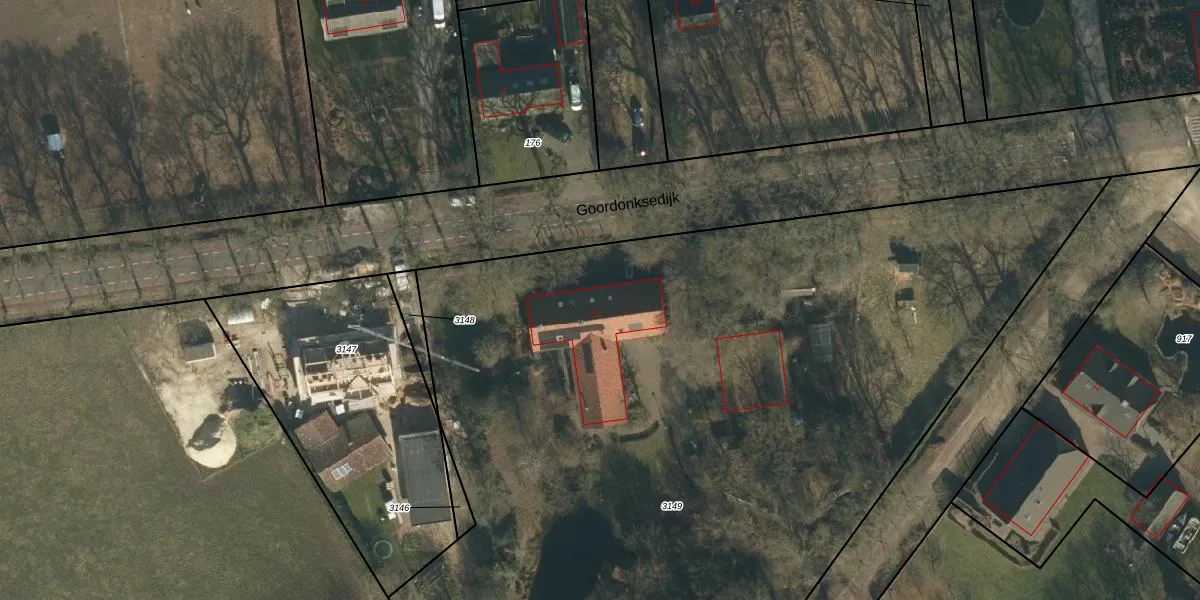 Het perceel waarop Goordonksedijk 9 staat heeft een oppervlakte van 7139 m². Dit is een zeer groot perceel. De perceeloppervlakte wordt geregistreerd door het Kadaster. Gedetailleerde informatie over de maten van dit perceel kunt u vinden in het rapport Kadastrale kaart met maatvoering van Goordonksedijk 9.
