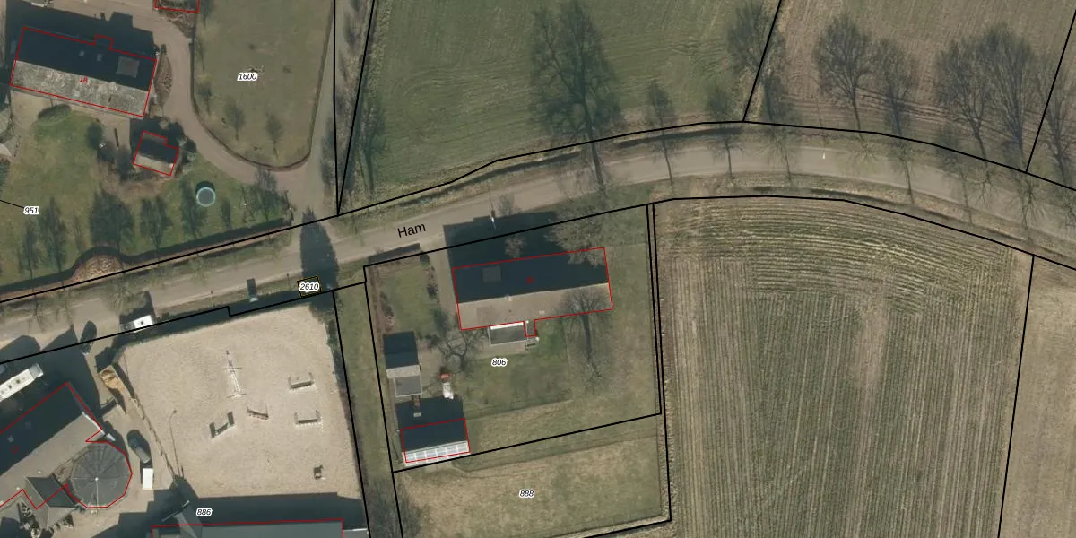 Het perceel waarop Ham 19 staat heeft een oppervlakte van 2020 m². Dit is een zeer groot perceel. De perceeloppervlakte wordt geregistreerd door het Kadaster. Gedetailleerde informatie over de maten van dit perceel kunt u vinden in het rapport Kadastrale kaart met maatvoering van Ham 19.