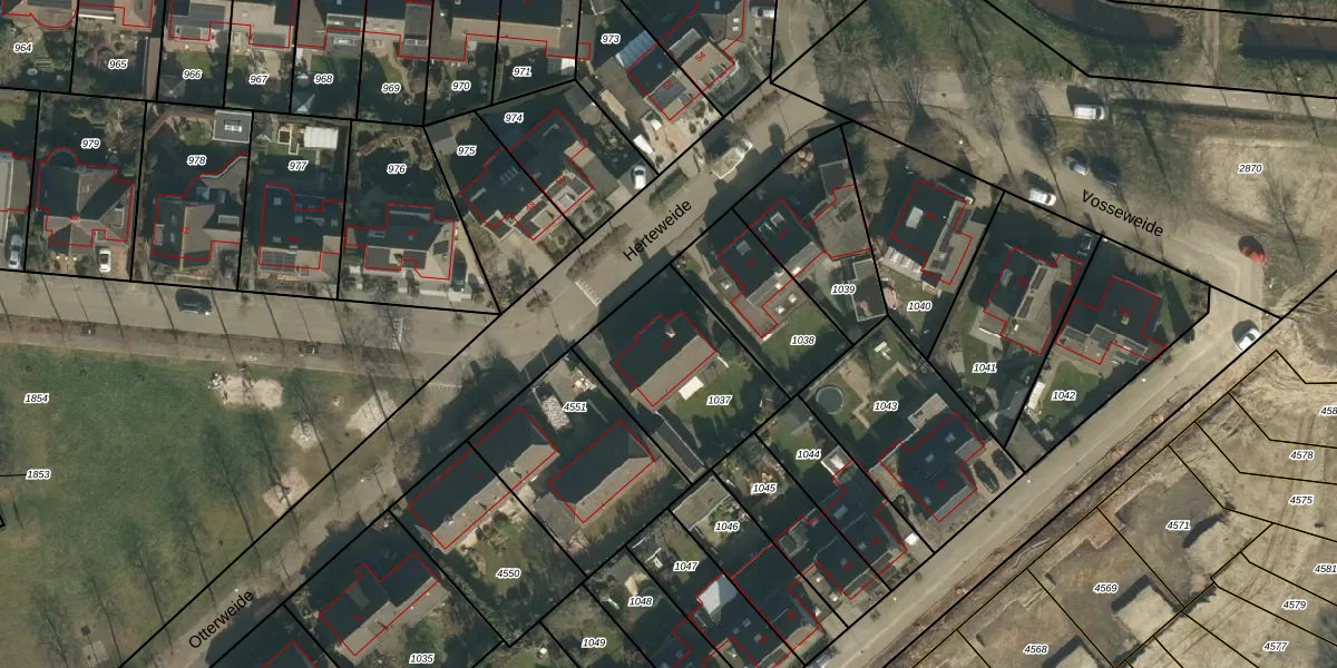 Het perceel waarop Herteweide 43 staat heeft een oppervlakte van 533 m². Dit is een groot perceel. De perceeloppervlakte wordt geregistreerd door het Kadaster. Gedetailleerde informatie over de maten van dit perceel kunt u vinden in het rapport Kadastrale kaart met maatvoering van Herteweide 43.