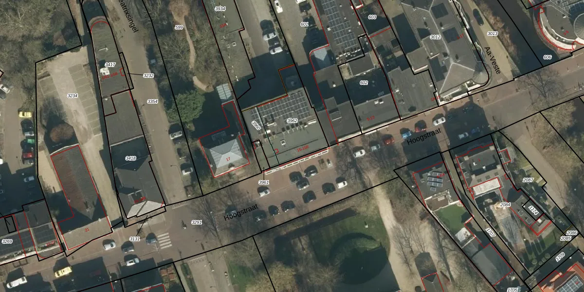 Het perceel waarop Hoogstraat 15-D staat heeft een oppervlakte van 444 m². Dit is een groot perceel. De perceeloppervlakte wordt geregistreerd door het Kadaster. Gedetailleerde informatie over de maten van dit perceel kunt u vinden in het rapport Kadastrale kaart met maatvoering van Hoogstraat 15-D.